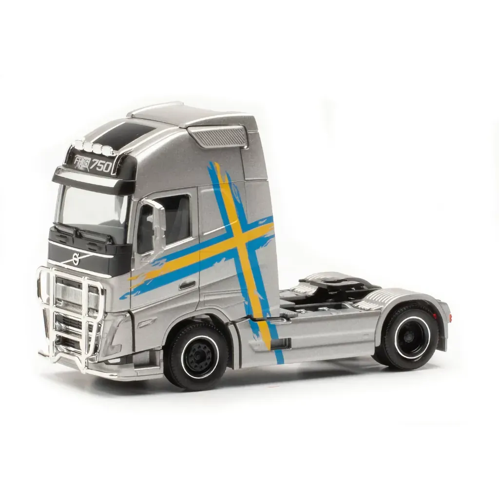 Volvo FH16 Globetrotter XL 750 som modellbil i skala 1:87 (7 cm) från Herpa. Dragbilen är silverfärgad med den svenska flaggan dekorerad över hytten.