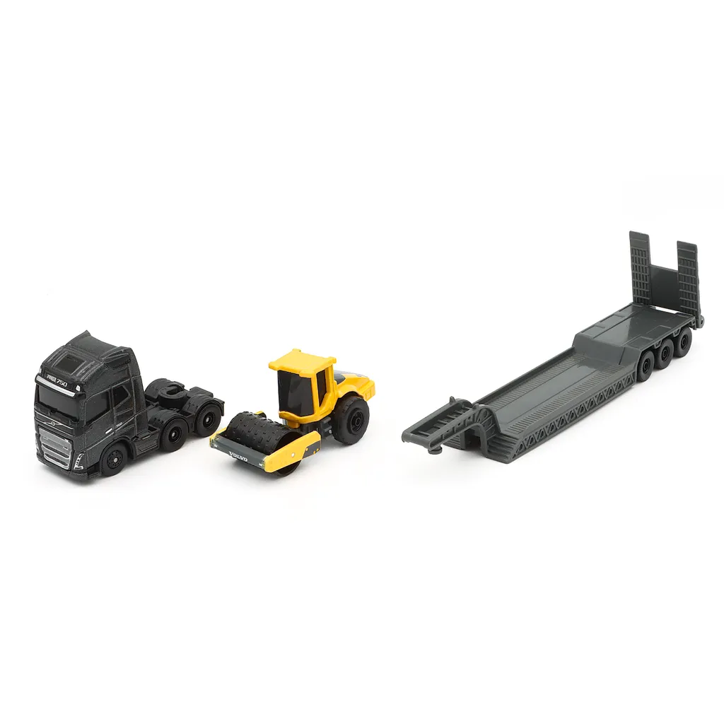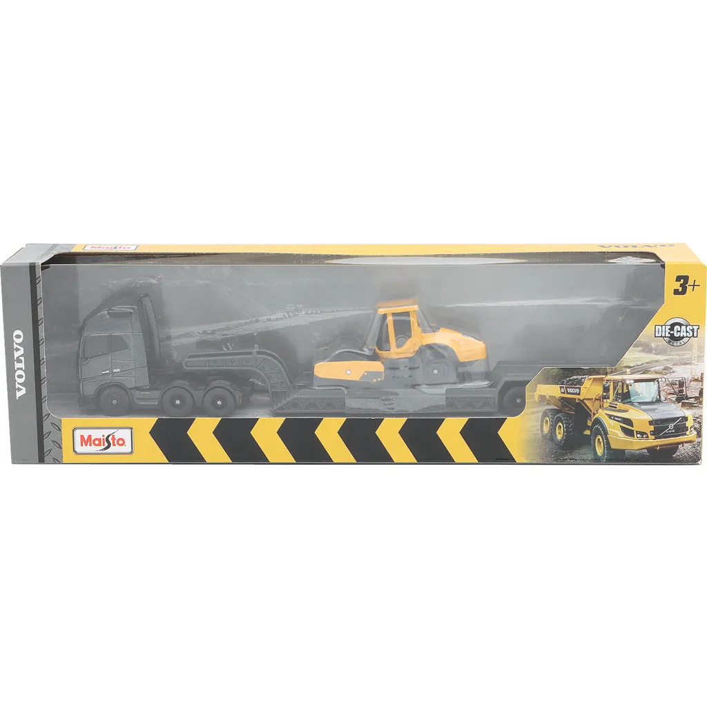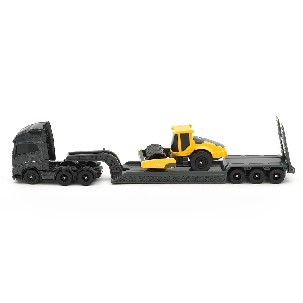 Dragbilen Volvo FH16 i mörkgrått med trailer transporterar en Volvo SD160B vält. Leksaken är 22 cm lång och tillverkad av Maisto.