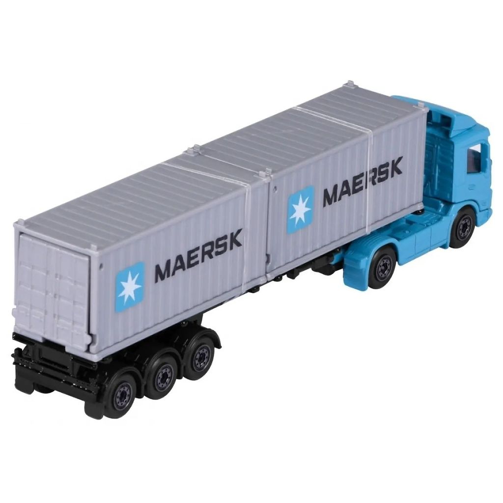 Dragbilen Volvo FMX drar två 20-fotscontainrar på trailer. Ekipaget ingår i Majorettes serie Logistic med Maersk-tema.