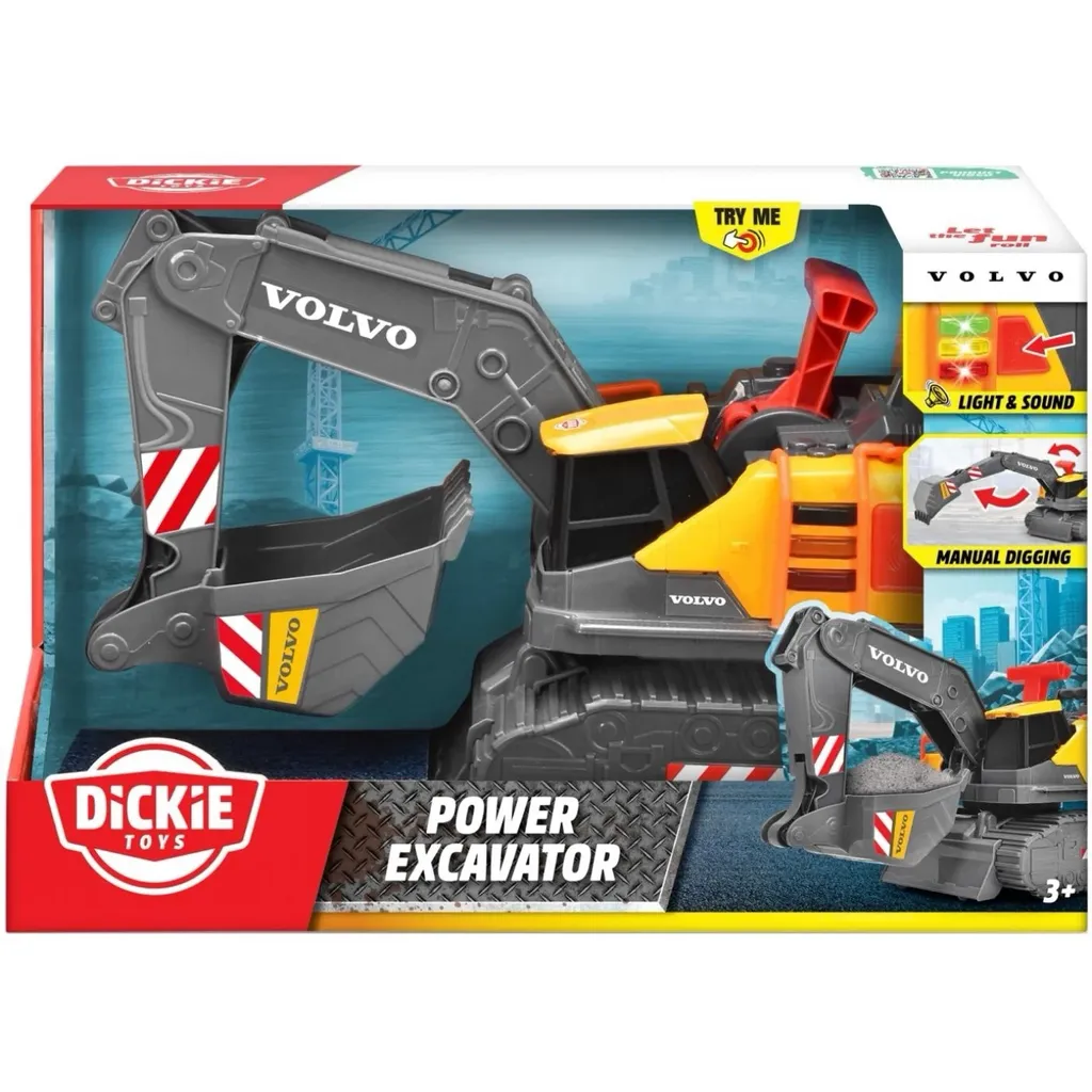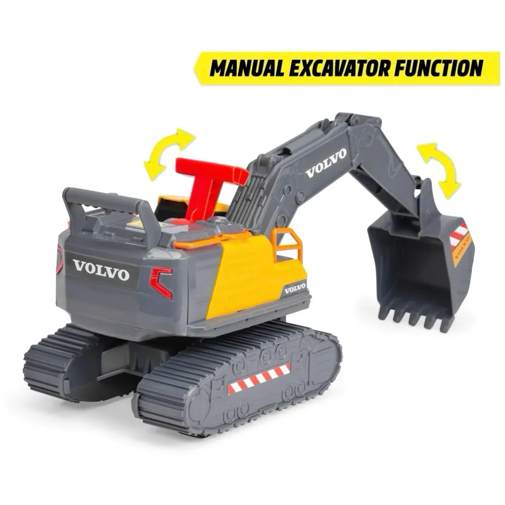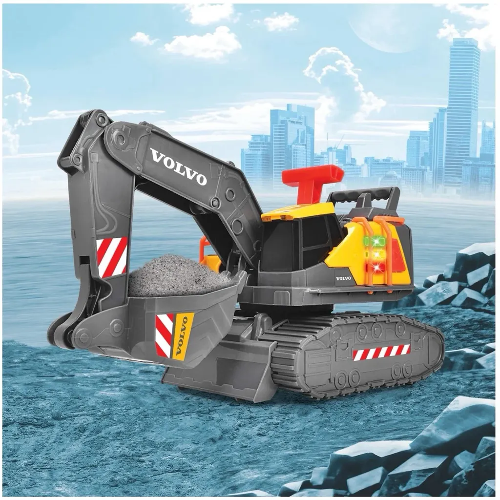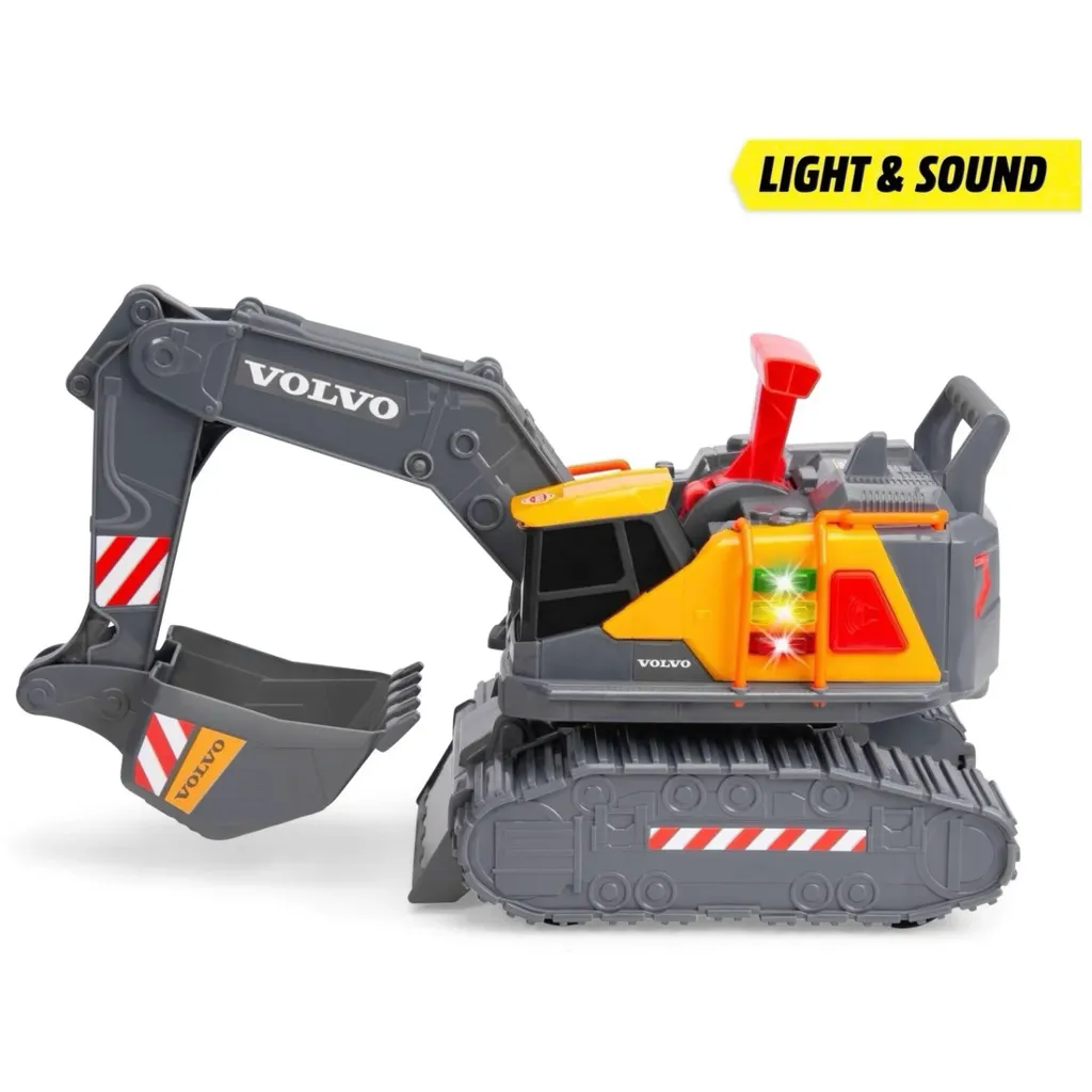 Volvo-grävare från Dickie Toys med ljud- och ljusfunktion. Grävaren har en röd spak som används för att styra skopan upp och ned.