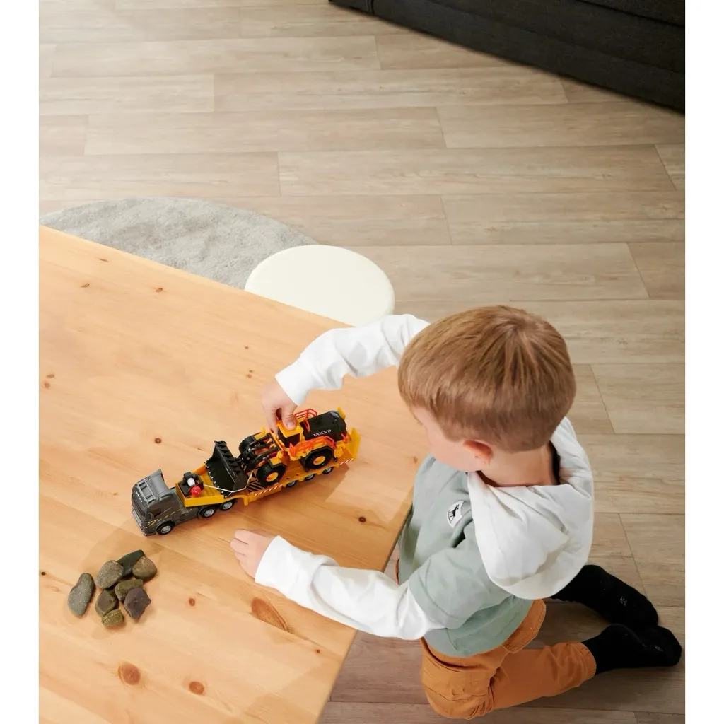 En Volvo FH16 med trailer som transporterar en Volvo L350H hjullastare från Majorette i deras serie med större fordon, Majorette Grand Series. Hjullastaren är 21 cm och hela ekipaget med dragbil och trailer är 35 cm.