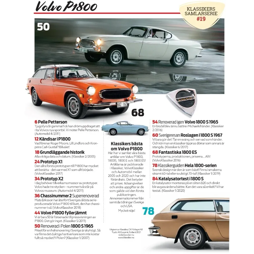 Tidningen är nummer 18 i serien Klassikers Samlarserie som utges av OK Förlaget. Tidningen innehåller artiklar från Klassikers produktion om Volvo P1800, 1800 S, 1800 E och 1800 ES.