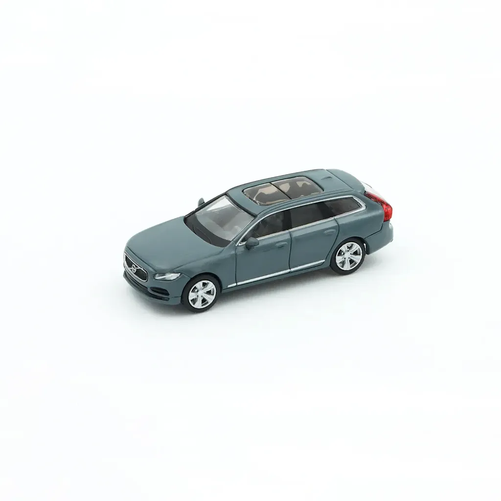 Volvo V90, årsmodell 2019, i grått som liten modellbil tillverkad av PCX87. Skalan är 1:87 vilket innebär att denna miniatyrmodell är 5,5 cm lång.