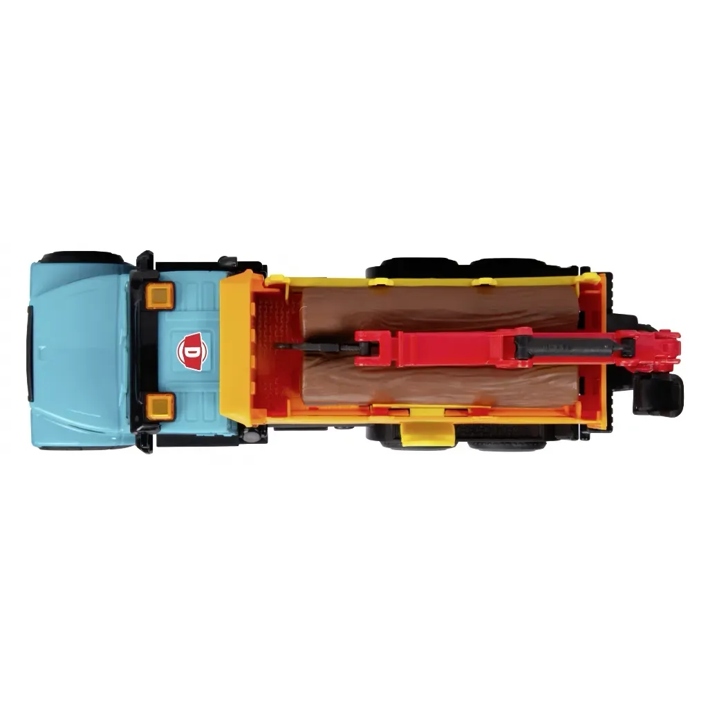 Volvo VHD 300 i blått som leksakstimmerbil med kran från Dickie Toys. Med lastbilen följer en fyra timmerstockar. Lastbilen är 22 cm lång och tillverkad i hållbar plast.