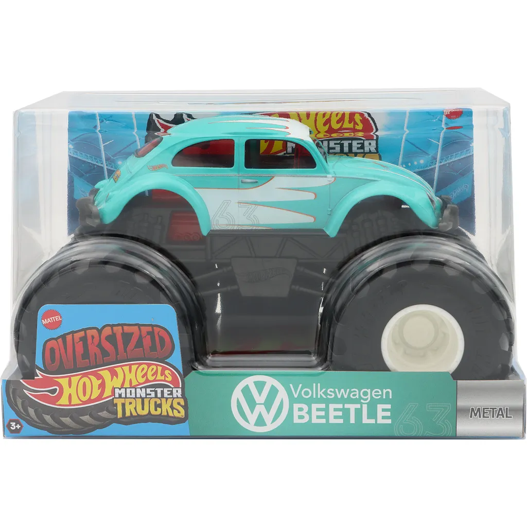 En Volkswagen Beetle som monstertruck från Hot Wheels Monster Trucks Oversized. Trucken är 20 cm lång (skala 1:24) och utrustad med stora gummihjul.