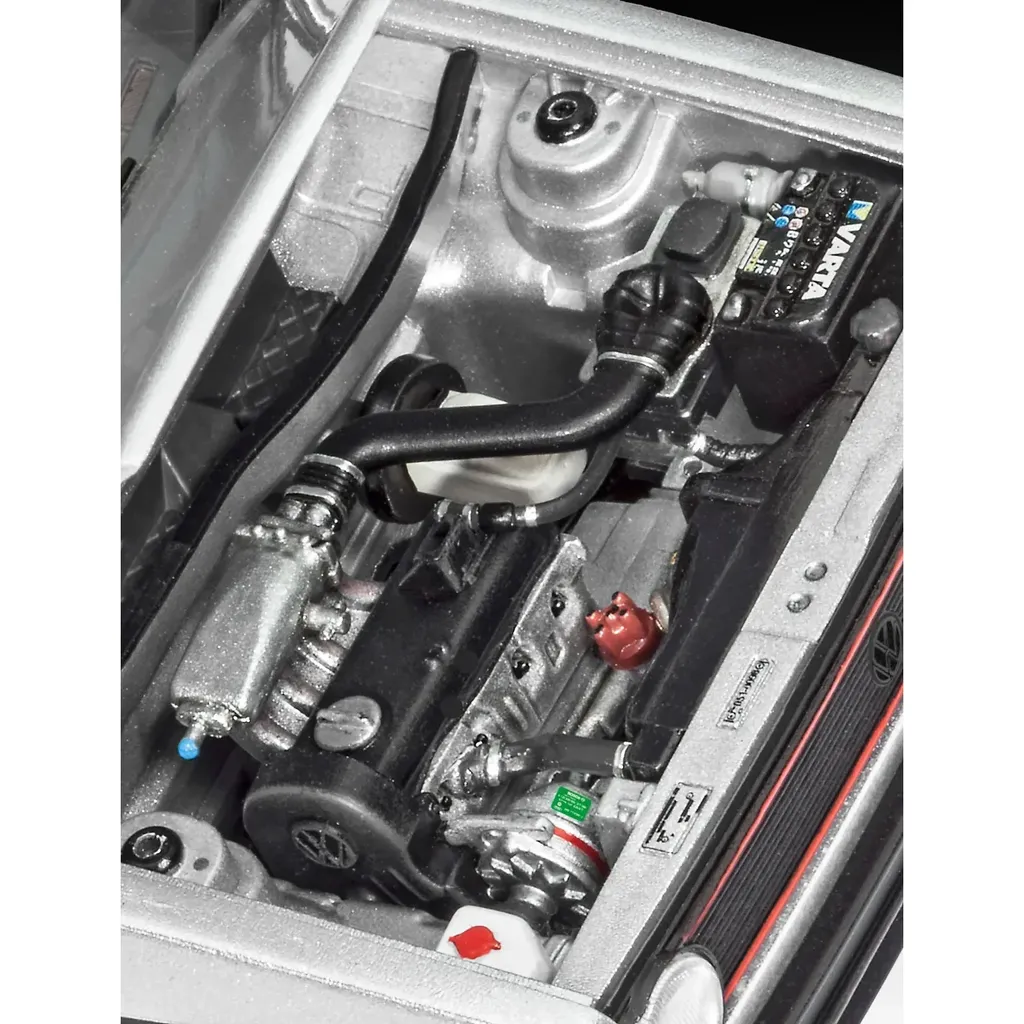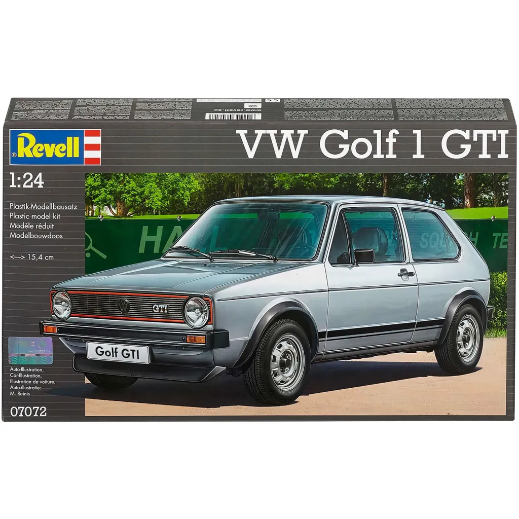 Byggsats i skala 1:24 från Revell. Byggsatsen är en modell av en Volkswagen Golf 1 GTI som hopbyggd blir 15,4 cm lång.