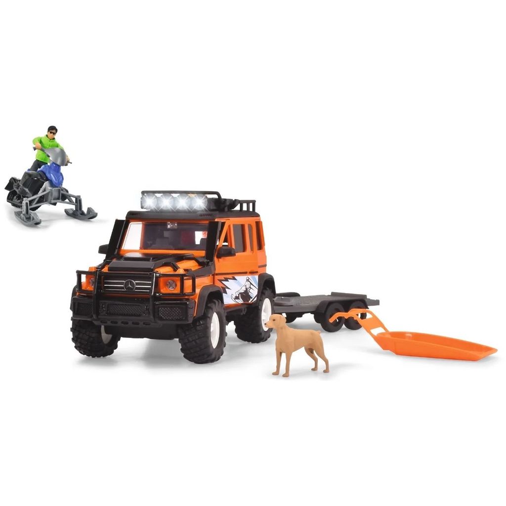 Lekset med ljud och ljus från Dickie Toys beståendes av en orange Mercedes G500 (jeep) som drar en trailer med en blå skoter från Yamaha. Medföljer gör också en fjällräddare, en hund och en räddningspulka.