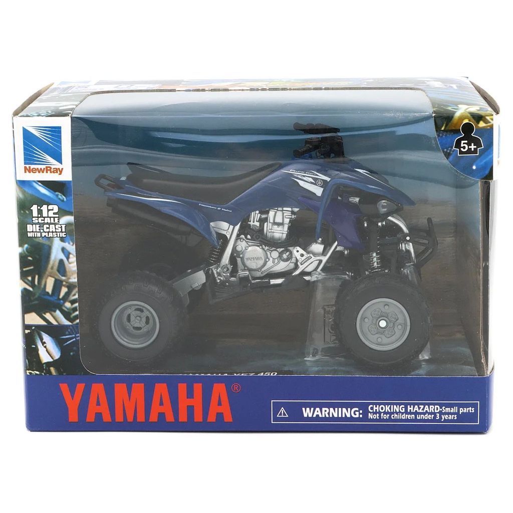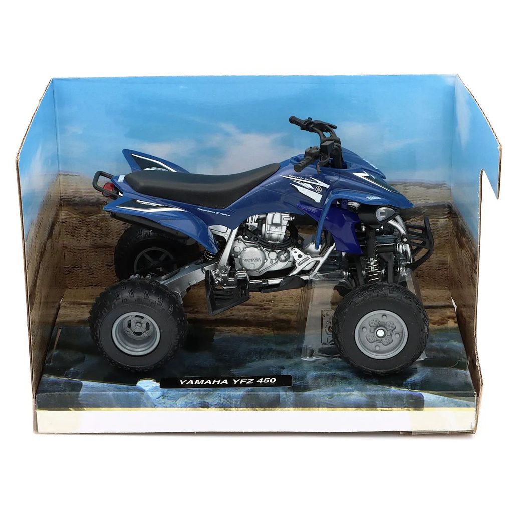 Blå Yamaha YFZ 450, fyrhjuling / ATV, från NewRay i skala 1:12 (längd 15 cm).
