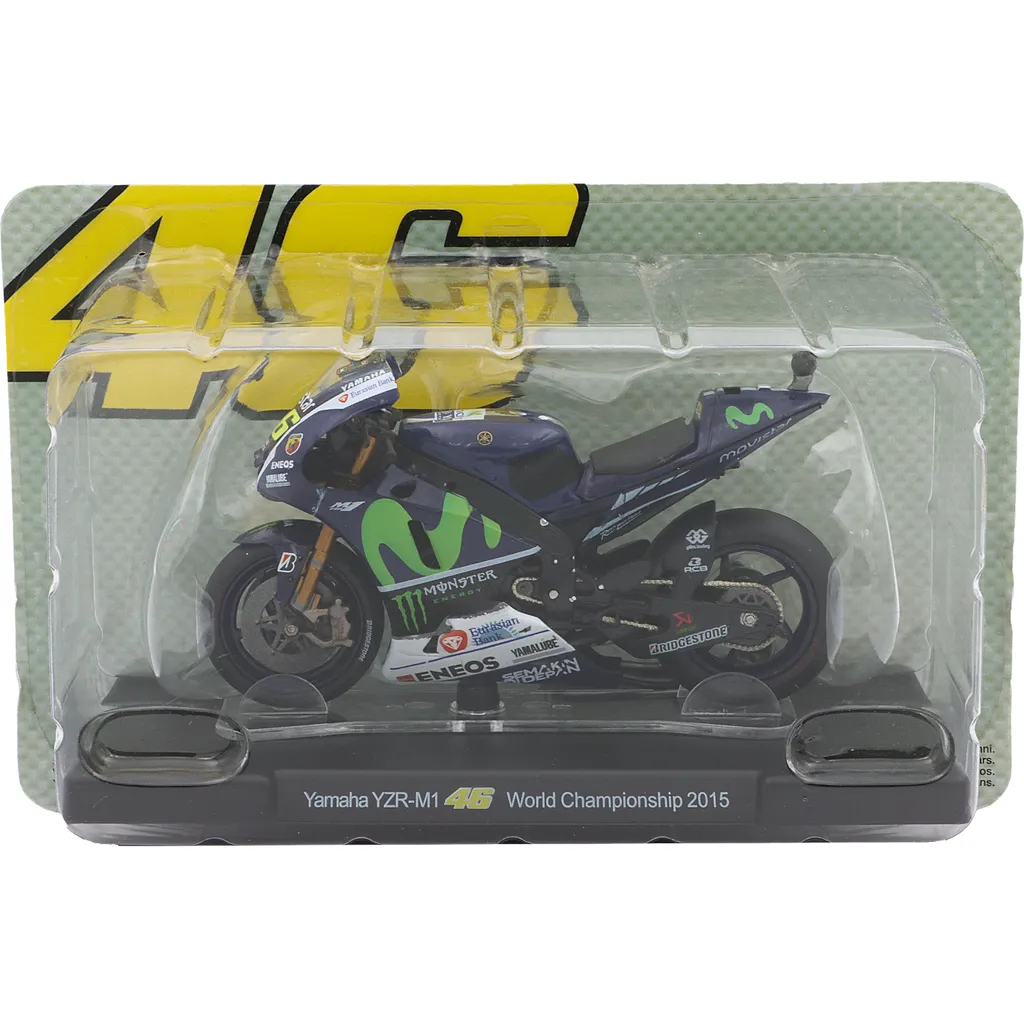 Motorcykeln står på en svart bottenplatta med texten "Yamaha YZR-M1 46 World Championship 2015"